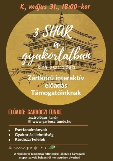 Garbóczi Tünde asztrológus, tanár folytatja az ’’3 SHAR megélései és feladatai a kínai asztrológiában” című előadását, immáron a Támogatóinknak, ahol interaktív formában, zártkörű jelleggel lehet részt venni, gyakorolni és kérdéseket feltenni akár a saját képletünkkel kapcsolatosan is. A zártkörű szakmai előadás alkalmával mélyebben belemegyünk a Szerencse Csillag feladataiba.