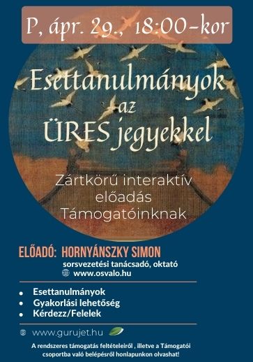 Hornyánszky Simon sorsvezetési tanácsadó, oktató folytatja az ’’Üresség (空 Kōng) fogalma a hagyományos sorsfejtésben” című előadását, immáron a Támogatóinknak, ahol interaktív formában, zártkörű jelleggel lehet részt venni, gyakorolni és kérdéseket feltenni akár a saját képletünkkel kapcsolatosan is. A zártkörű szakmai előadás alkalmával az esettanulmányok értelmezésén keresztül mélyebben belemegyünk a klasszikus sorsfejtési művek adta útmutatásokba.