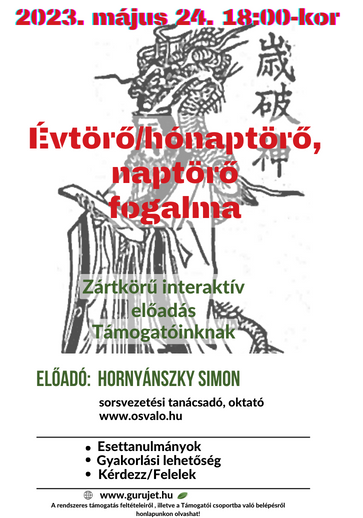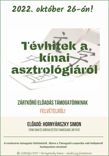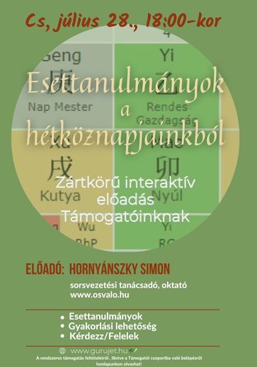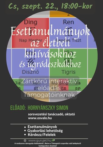 Hornyánszky Simon sorsvezetési tanácsadó, oktató folytatja ’’Az Erény (德 Dé) fogalma a hagyományos sorsfejtésben” című előadását, immáron a Támogatóinknak, ahol interaktív formában, zártkörű jelleggel lehet részt venni, gyakorolni és kérdéseket feltenni akár a saját képletünkkel kapcsolatosan is. A zártkörű szakmai előadás alkalmával az esettanulmányok értelmezésén keresztül mélyebben belemegyünk a klasszikus sorsfejtési művek adta útmutatásokba.