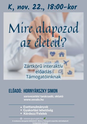 Az előadás Támogatóink részére lesz elérhető, melyet 2022. november 22-én, kedden, 18 órakor tartunk ZOOM előadótermünkben. Az erről készült videofelvételt a Támogatói csoportba töltjük fel (keleti csoport), ahol korlátlan ideig megtekinthető.