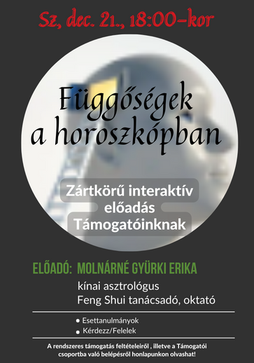 Az előadás Támogatóink részére lesz elérhető, melyet 2022. december 21-én, szerdán, 18 órakor tartunk ZOOM előadótermünkben. Az erről készült videofelvételt a Támogatói csoportba töltjük fel (keleti csoport), ahol korlátlan ideig megtekinthető.